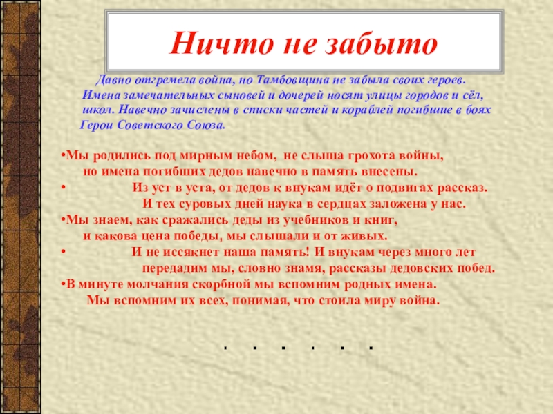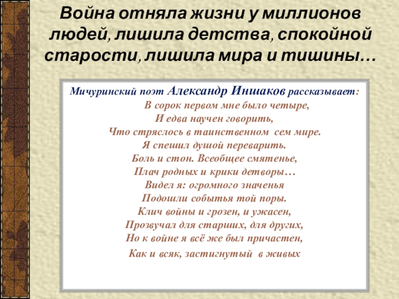 Война отняла жизни у миллионов людей, лишила детства, спокойной старости, лишила мира и тишины…
