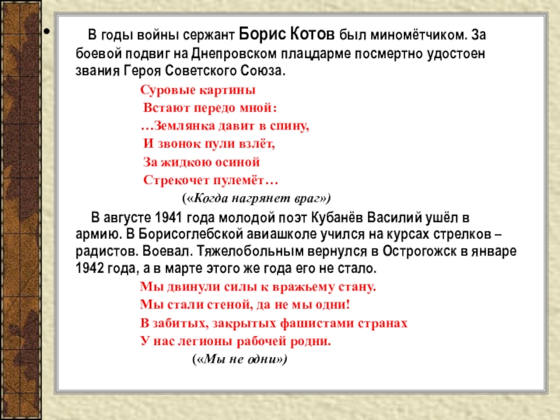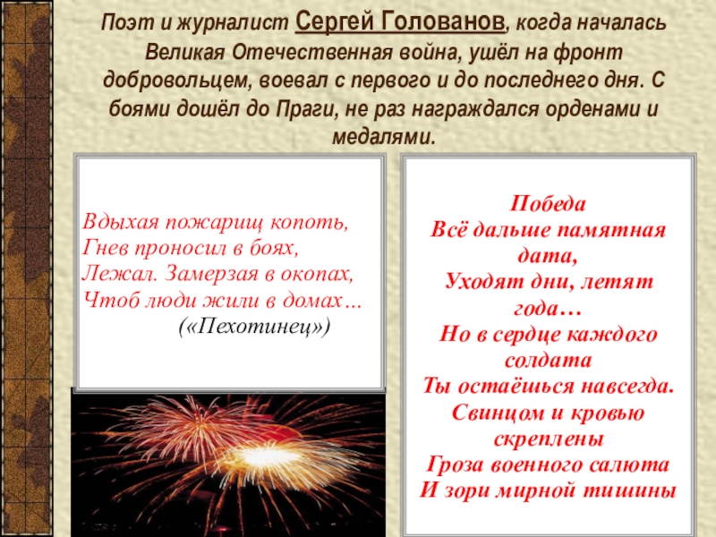 Поэт и журналист Сергей Голованов, когда началась Великая Отечественная война, ушёл на фронт добровольцем, воевал с первого и до последнего дня. С боями дошёл до Праги, не раз награждался орденами и медалями.