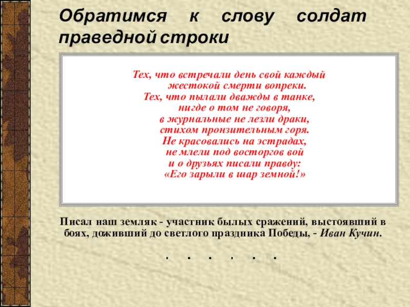 Писал наш земляк - участник былых сражений, выстоявший в боях, доживший до светлого праздника Победы, - Иван Кучин.