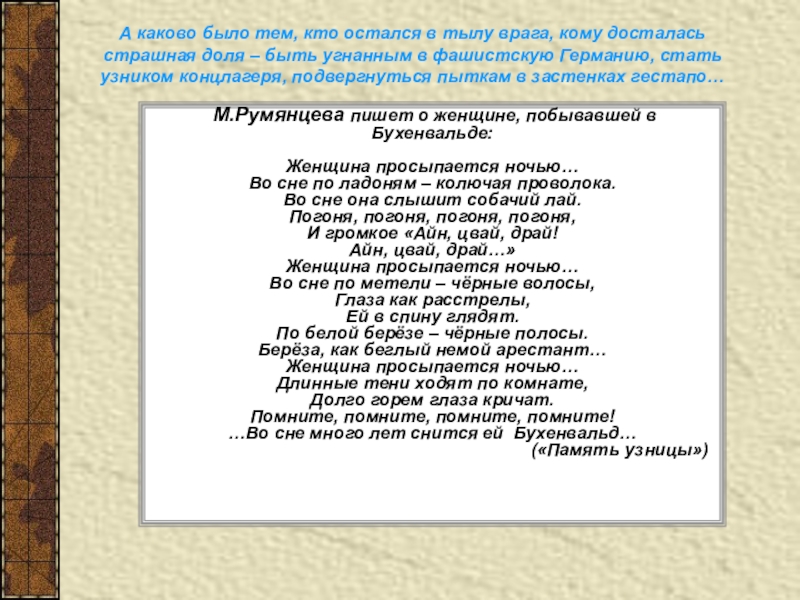 А каково было тем, кто остался в тылу врага, кому досталась страшная доля – быть угнанным в фашистскую Германию, стать узником концлагеря, подвергнуться пыткам в застенках гестапо…