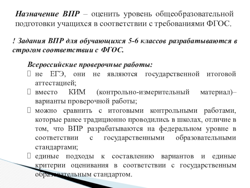 * Кроме того, ВПР позволят осуществлять мониторинг результатов введения ФГОС и послужат развитию единого образовательного пространства в Российской Федерации.