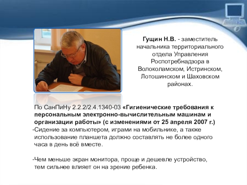 По СанПиНу 2.2.2/2.4.1340-03 «Гигиенические требования к персональным электронно-вычислительным машинам и организации работы» (с изменениями от 25 апреля 2007 г.)