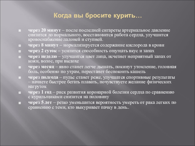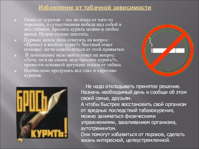 А чтобы быстрее восстановить свой организм от вредных последствий табакокурения, можно заниматься физическими упражнениями, закаливанием организма, аутотренингом.