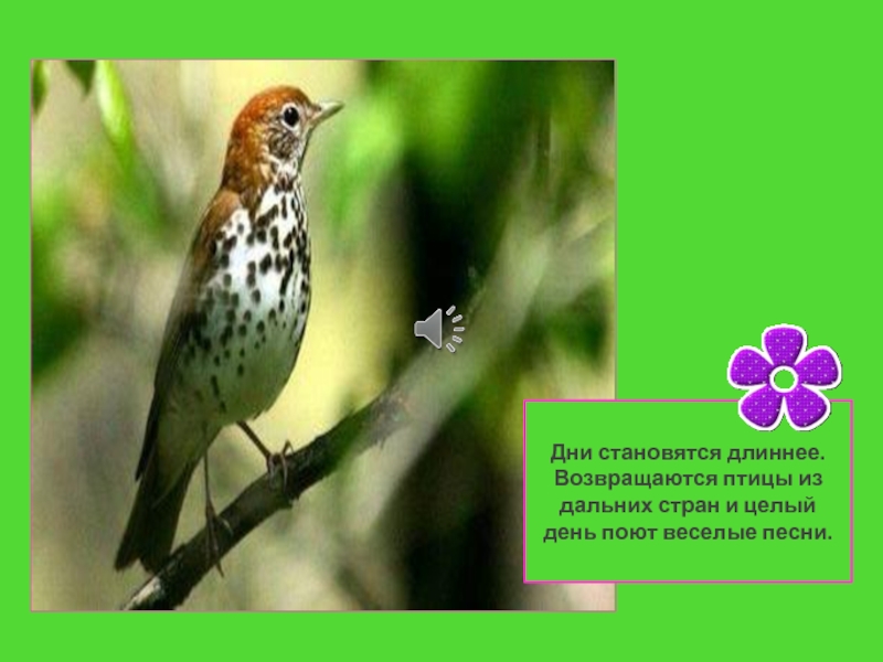 Слайд 14Дни становятся длиннее. Возвращаются птицы из дальних стран и целый день