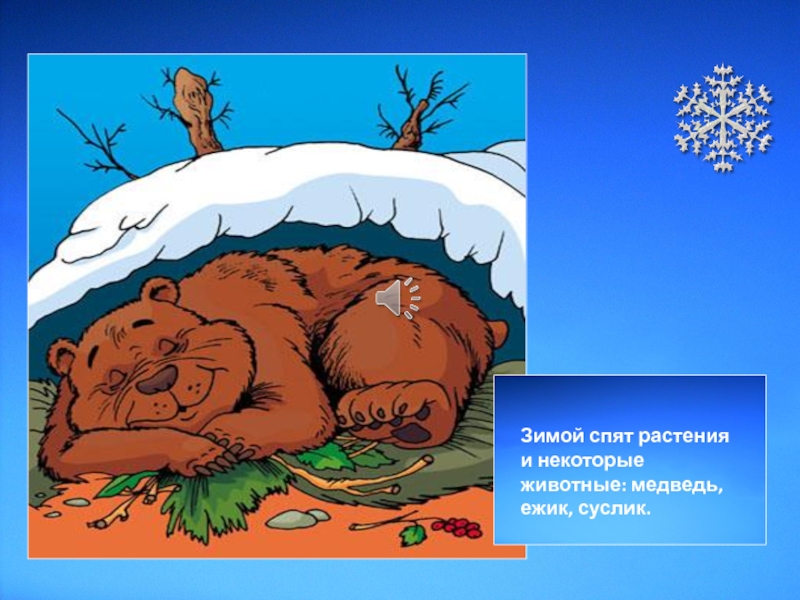 Слайд 6Зимой спят растения и некоторые животные: медведь, ежик, суслик.