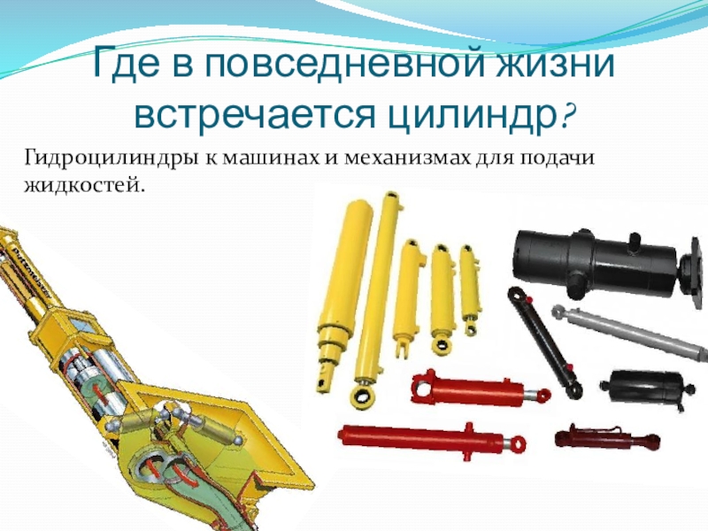 Где в повседневной жизни встречается цилиндр?Гидроцилиндры к машинах и механизмах для подачи жидкостей.
