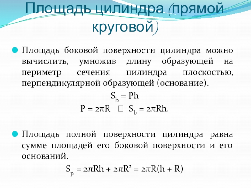 Площадь цилиндра (прямой круговой)Площадь боковой поверхности цилиндра можно вычислить, умножив длину образующей на периметр сечения цилиндра плоскостью,