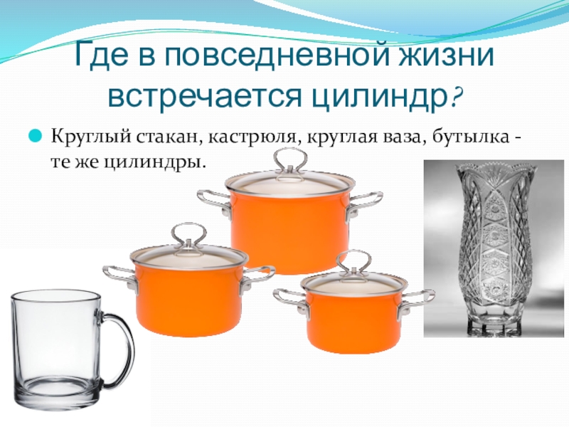 Где в повседневной жизни встречается цилиндр?Круглый стакан, кастрюля, круглая ваза, бутылка - те же цилиндры.