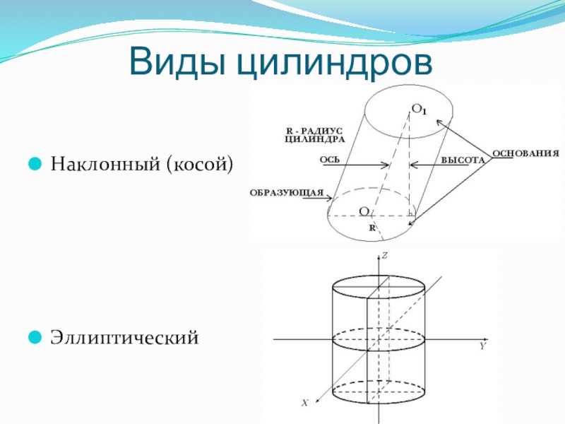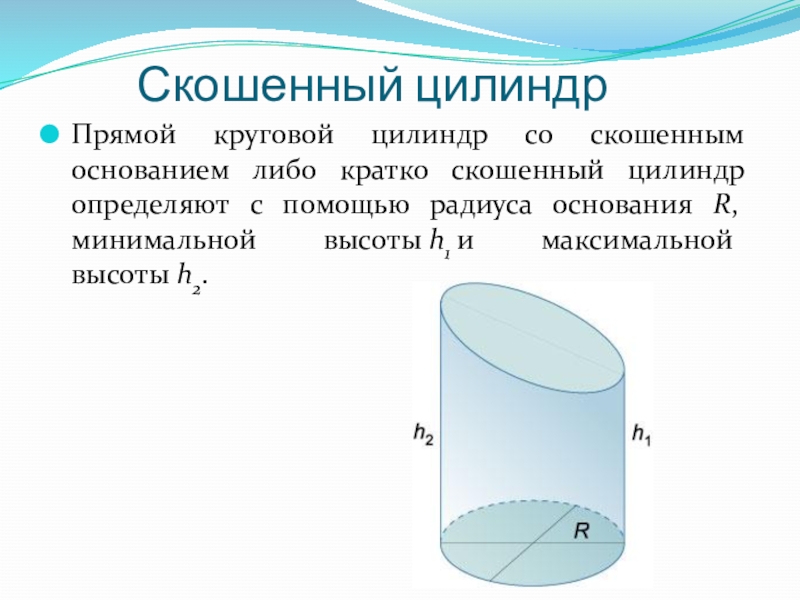 Скошенный цилиндрПрямой круговой цилиндр со скошенным основанием либо кратко скошенный цилиндр определяют с помощью радиуса основания R,