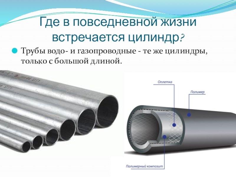 Где в повседневной жизни встречается цилиндр?Трубы водо- и газопроводные - те же цилиндры, только с большой длиной.
