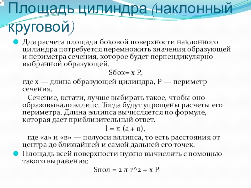 Площадь цилиндра (наклонный круговой)Для расчета площади боковой поверхности наклонного цилиндра потребуется перемножить значения образующей и периметра сечения,