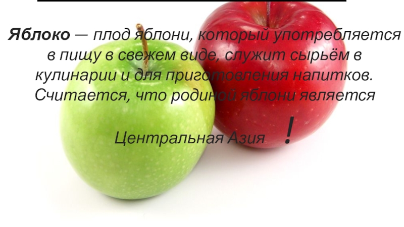 виде, служит сырьём в кулинарии и для приготовления напитков. Считается, что родиной яблони является Центральная Азия   !