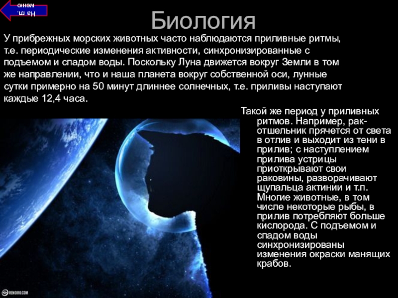 У прибрежных морских животных часто наблюдаются приливные ритмы, т.е. периодические изменения активности, синхронизированные с подъемом и спадом воды. Поскольку Луна движется вокруг Земли в том же направлении, что и наша планета вокруг собственной оси, лунные сутки примерно на 50 минут длиннее солнечных, т.е. приливы наступают каждые 12,4 часа.