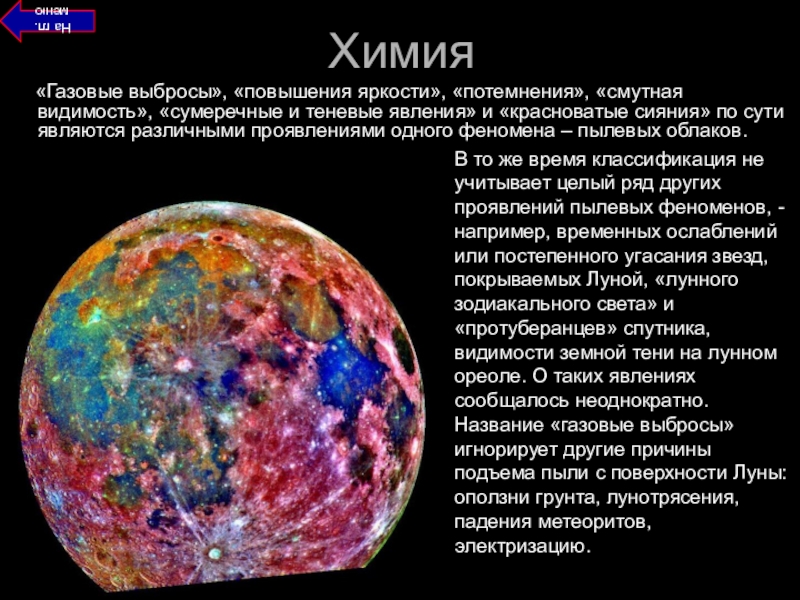 В то же время классификация не учитывает целый ряд других проявлений пылевых феноменов, - например, временных ослаблений или постепенного угасания звезд, покрываемых Луной, «лунного зодиакального света» и «протуберанцев» спутника, видимости земной тени на лунном ореоле. О таких явлениях сообщалось неоднократно. Название «газовые выбросы» игнорирует другие причины подъема пыли с поверхности Луны: оползни грунта, лунотрясения, падения метеоритов, электризацию.