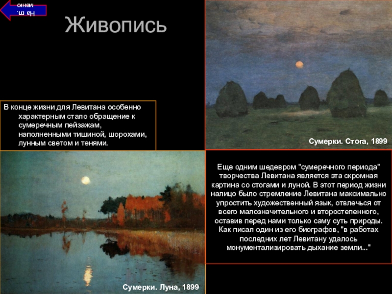 Еще одним шедевром "сумеречного периода" творчества Левитана является эта скромная картина со стогами и луной. В этот период жизни налицо было стремление Левитана максимально упростить художественный язык, отвлечься от всего малозначительного и второстепенного, оставив перед нами только саму суть природы. Как писал один из его биографов, "в работах последних лет Левитану удалось монументализировать дыхание земли..."