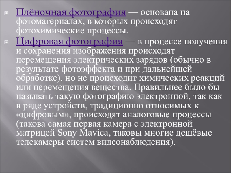 Плёночная фотография — основана на фотоматериалах, в которых происходят фотохимические процессы.Цифровая фотография — в процессе получения и сохранения изображения