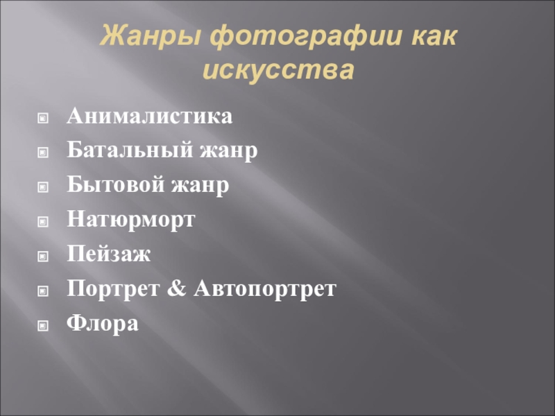 Жанры фотографии как искусстваАнималистикаБатальный жанрБытовой жанрНатюрмортПейзажПортрет & АвтопортретФлора