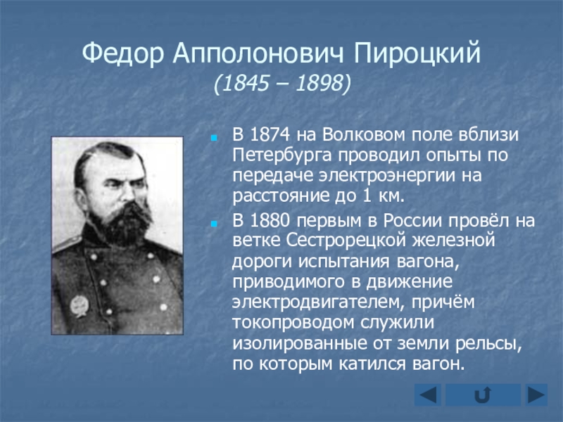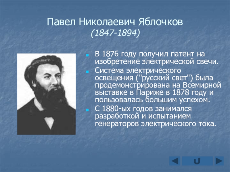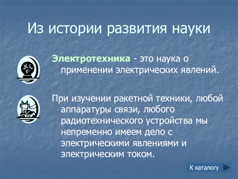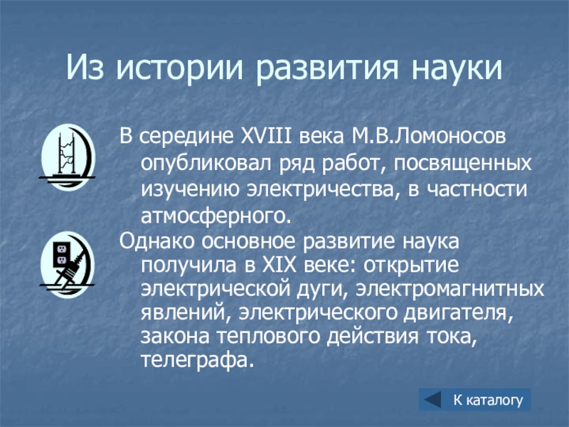 Однако основное развитие наука получила в XIX веке: открытие электрической дуги, электромагнитных явлений, электрического двигателя, закона теплового действия тока, телеграфа.