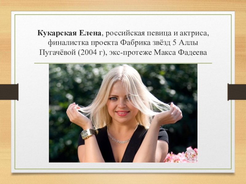 Слайд 21Кукарская Елена, российская певица и актриса, финалистка проекта Фабрика звёзд 5