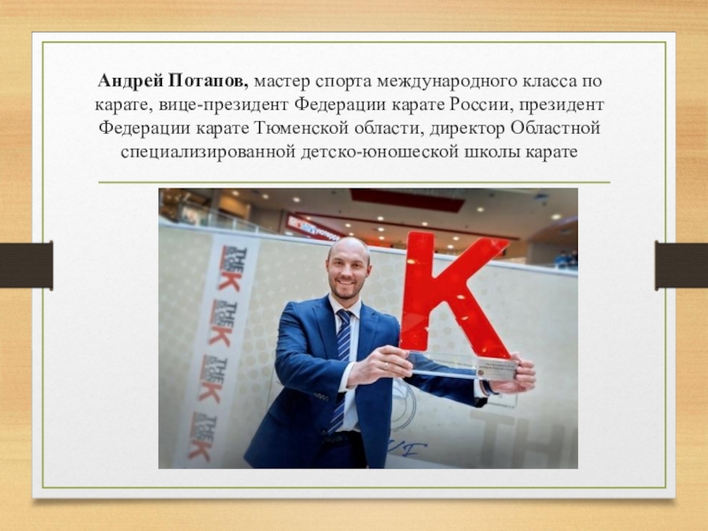 Слайд 38Андрей Потапов, мастер спорта международного класса по карате, вице-президент Федерации карате России,