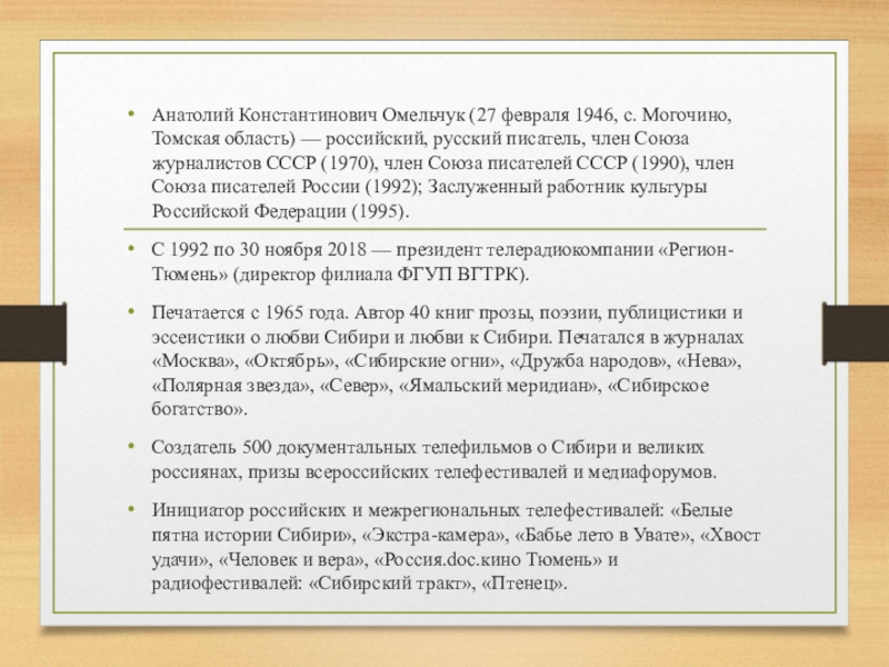 Слайд 45Анатолий Константинович Омельчук (27 февраля 1946, с. Могочино, Томская область) —
