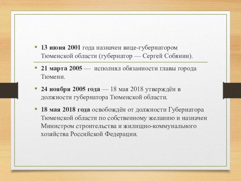 Слайд 5613 июня 2001 года назначен вице-губернатором Тюменской области (губернатор — Сергей