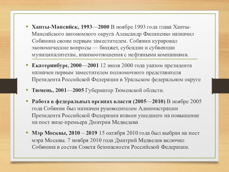 Мэр Москвы, 2010 – 2019 15 октября 2010 года был выбран на пост мэра Москвы. 7 ноября 2010 года Дмитрий Медведев включил Собянина в состав Совета безопасности Российской Федерации.