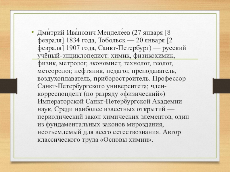 Слайд 28Дми́трий Ива́нович Менделе́ев (27 января [8 февраля] 1834 года, Тобольск —