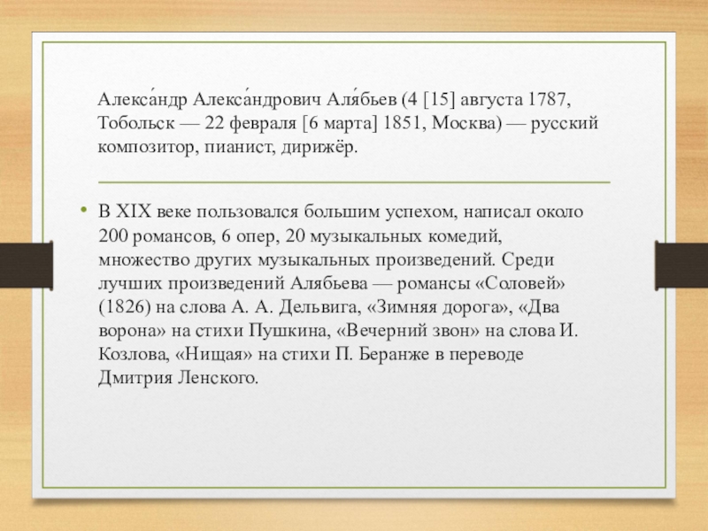 Слайд 15Алекса́ндр Алекса́ндрович Аля́бьев (4 [15] августа 1787, Тобольск — 22 февраля