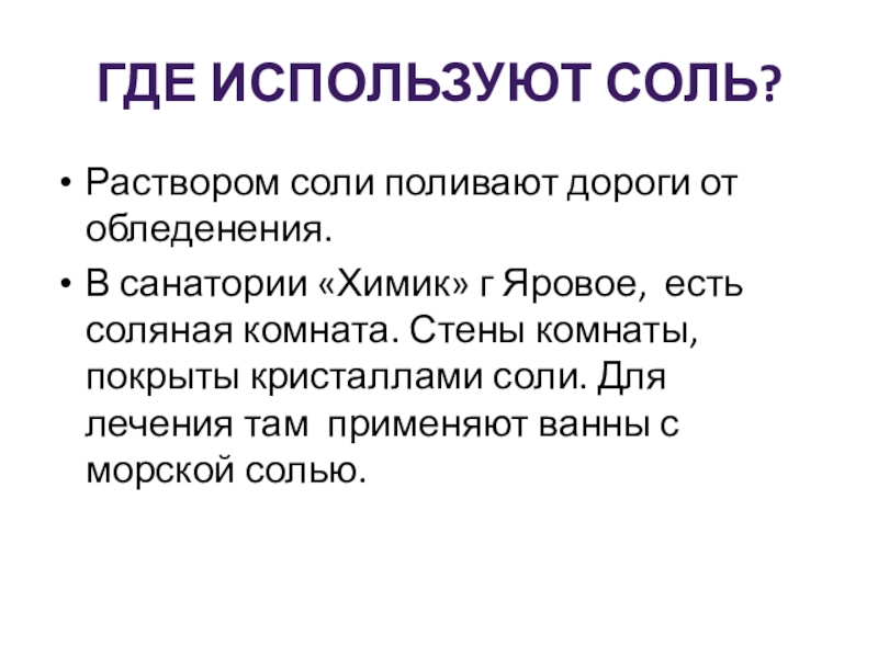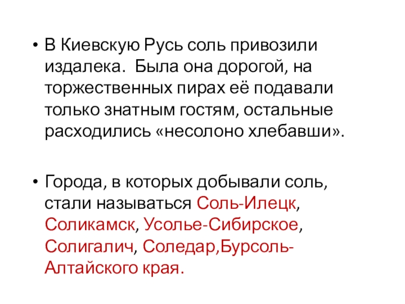 Города, в которых добывали соль, стали называться Соль-Илецк, Соликамск, Усолье-Сибирское, Солигалич, Соледар,Бурсоль- Алтайского края.