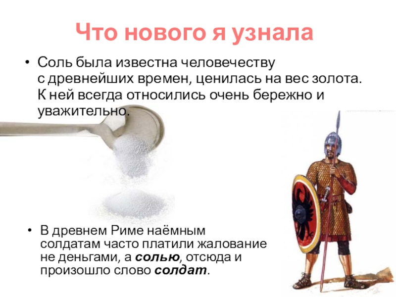 В древнем Риме наёмным солдатам часто платили жалование не деньгами, а солью, отсюда и произошло слово солдат.