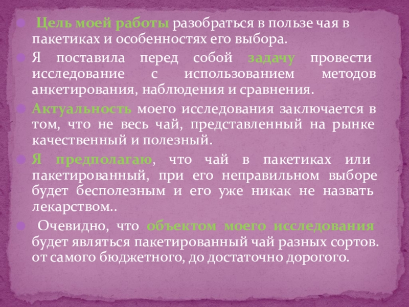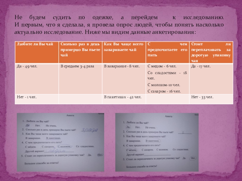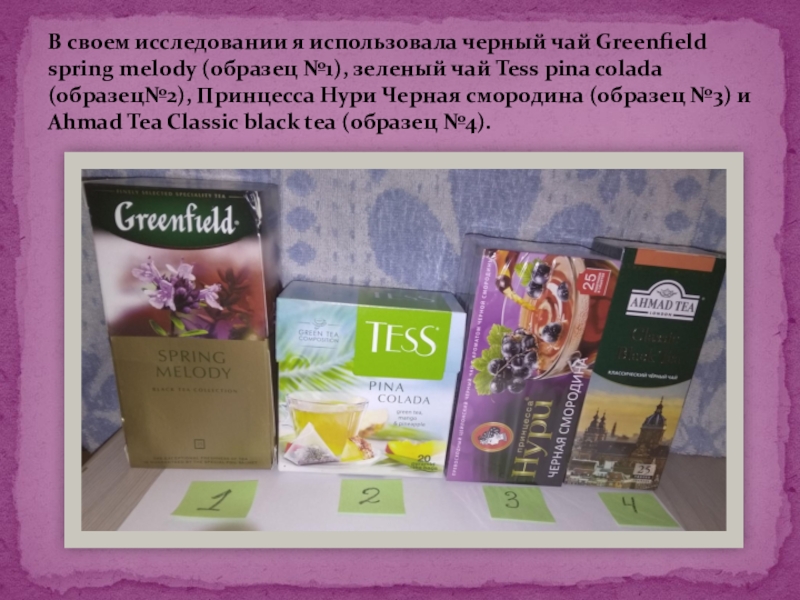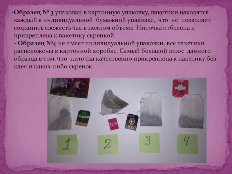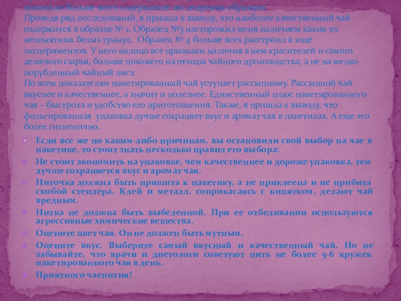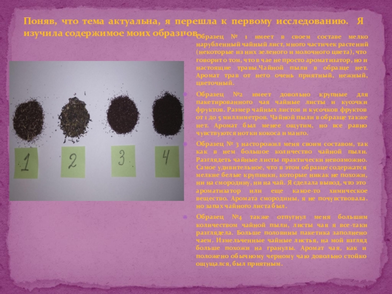 Проведя ряд исследований, я пришла к выводу, что наиболее качественный чай содержится в образце № 1. Образец №3 насторожил меня наличием каких-то непонятных белых гранул. Образец № 4 больше всех расстроил в ходе экспериментов. У него налицо все признаки наличия в нем красителей и самого дешевого сырья, больше похожего на отходы чайного производства, а не на мелко порубленный чайный лист.