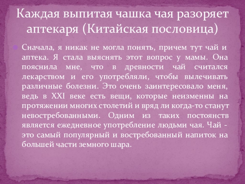 Каждая выпитая чашка чая разоряет аптекаря (Китайская пословица)