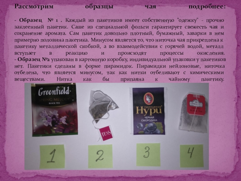 Изучив со всех сторон рассматриваемые образцы, я поняла, что не зря многие люди предпочитают чай, который нужно заваривать в заварочном чайнике. На мое мнение повлияло больше всего содержимое исследуемых образцов.