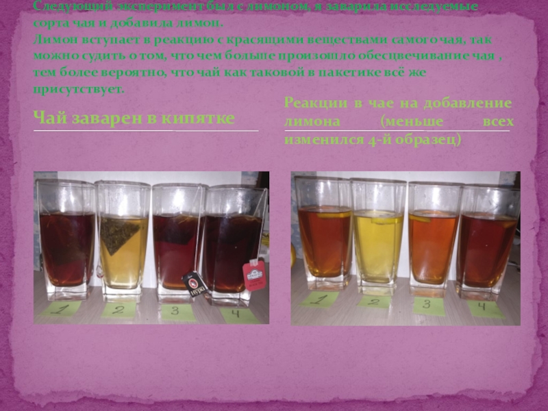 Реакции в чае на добавление лимона (меньше всех изменился 4-й образец)