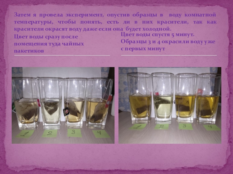 Цвет воды спустя 5 минут. Образцы 3 и 4 окрасили воду уже с первых минут