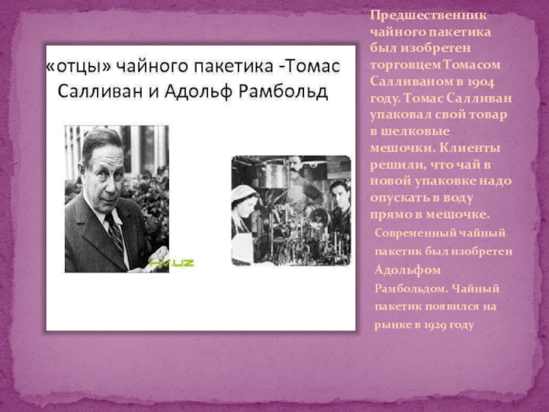 Современный чайный пакетик был изобретен Адольфом Рамбольдом. Чайный пакетик появился на рынке в 1929 году
