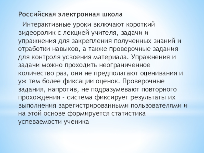 учителя, задачи и упражнения для закрепления полученных знаний и отработки навыков, а также проверочные задания для контроля усвоения материала. Упражнения и задачи можно проходить неограниченное количество раз, они не предполагают оценивания и уж тем более фиксации оценок. Проверочные задания, напротив, не подразумевают повторного прохождения – система фиксирует результаты их выполнения зарегистрированными пользователями и на этой основе формируется статистика успеваемости ученика