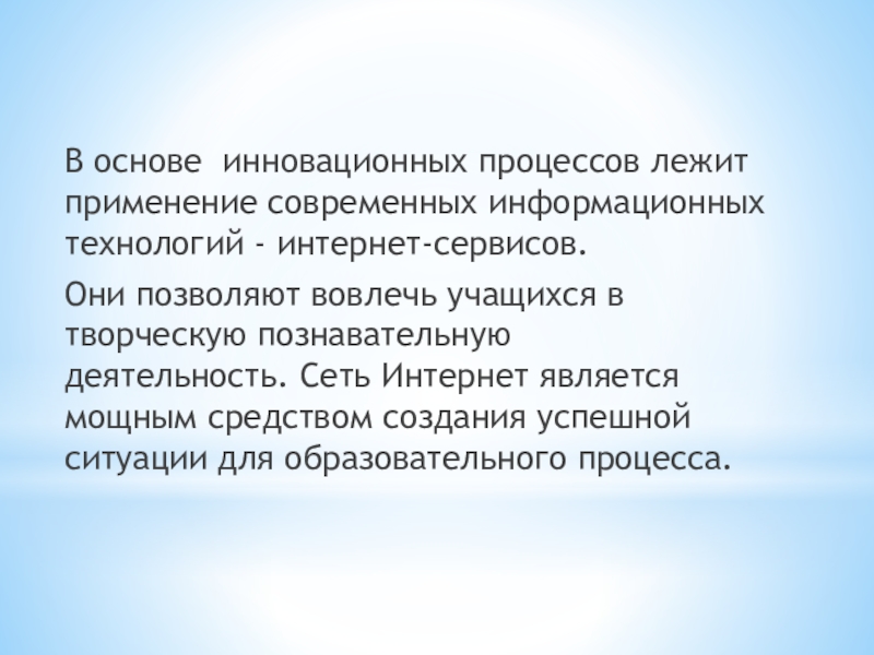 Слайд 4В основе инновационных процессов лежит применение современных информационных технологий - интернет-сервисов.