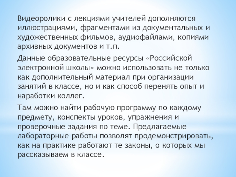 Данные образовательные ресурсы «Российской электронной школы» можно использовать не только как дополнительный материал при организации занятий в классе, но и как способ перенять опыт и наработки коллег.