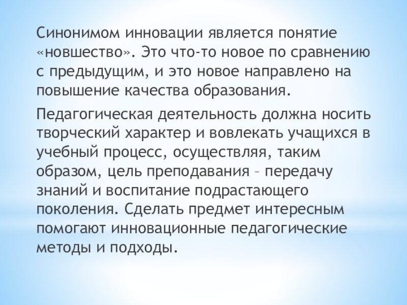Педагогическая деятельность должна носить творческий характер и вовлекать учащихся в учебный процесс, осуществляя, таким образом, цель преподавания – передачу знаний и воспитание подрастающего поколения. Сделать предмет интересным помогают инновационные педагогические методы и подходы.