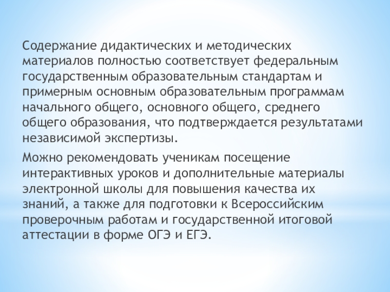Слайд 12Содержание дидактических и методических материалов полностью соответствует федеральным государственным образовательным стандартам