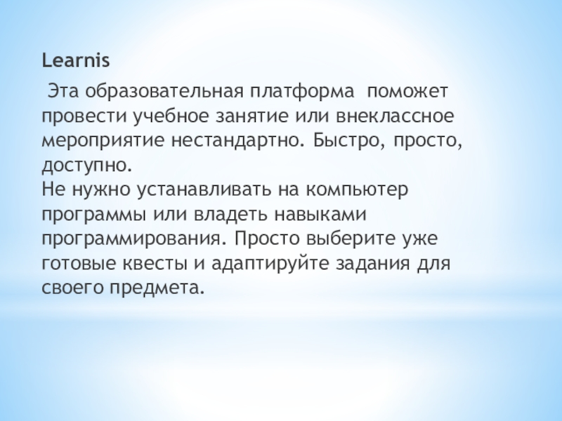 Не нужно устанавливать на компьютер программы или владеть навыками программирования. Просто выберите уже готовые квесты и адаптируйте задания для своего предмета.