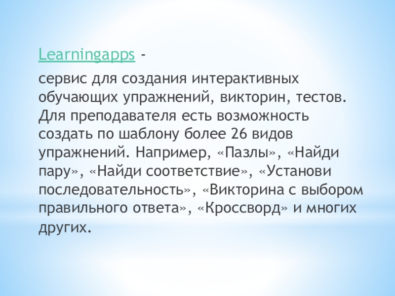 возможность создать по шаблону более 26 видов упражнений. Например, «Пазлы», «Найди пару», «Найди соответствие», «Установи последовательность», «Викторина с выбором правильного ответа», «Кроссворд» и многих других.