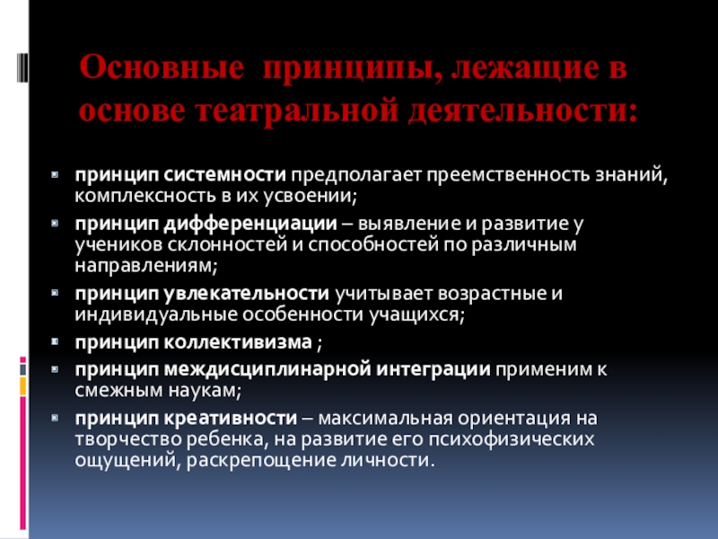 Слайд 10Основные принципы, лежащие в основе театральной деятельности: