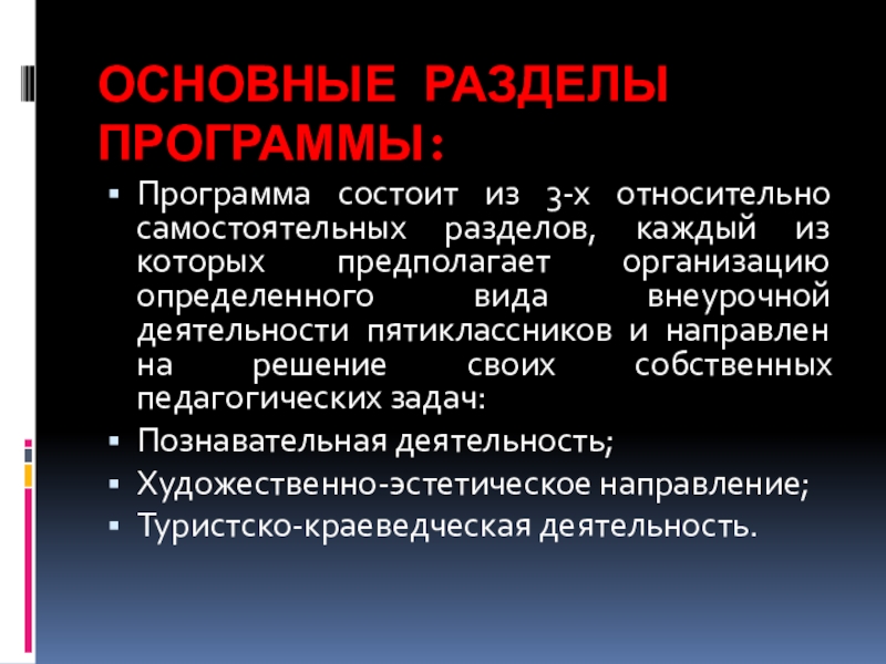 Слайд 8ОСНОВНЫЕ РАЗДЕЛЫ ПРОГРАММЫ: