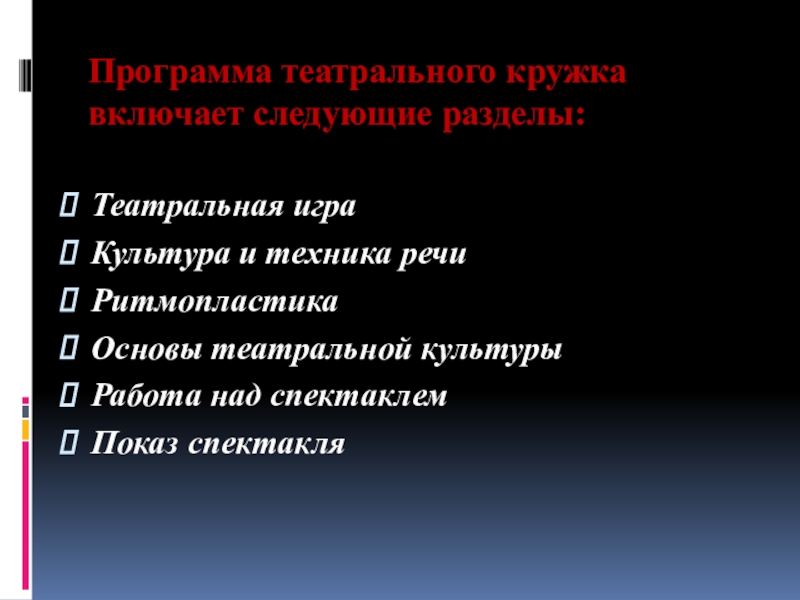 Слайд 12Программа театрального кружка включает следующие разделы: