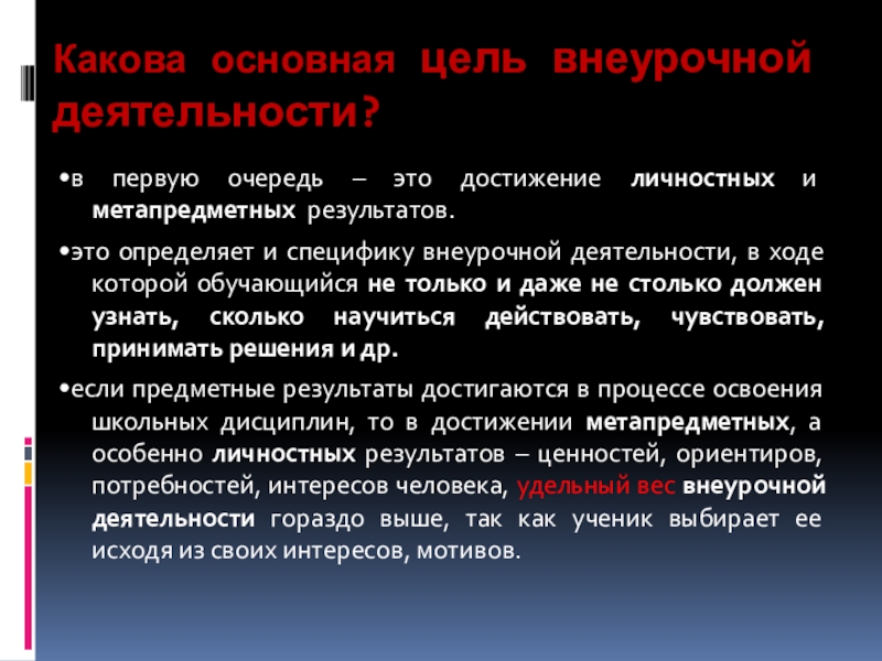 •если предметные результаты достигаются в процессе освоения школьных дисциплин, то в достижении метапредметных, а особенно личностных результатов – ценностей, ориентиров, потребностей, интересов человека, удельный вес внеурочной деятельности гораздо выше, так как ученик выбирает ее исходя из своих интересов, мотивов.