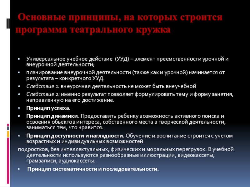 Слайд 9 Основные принципы, на которых строится программа театрального кружка
