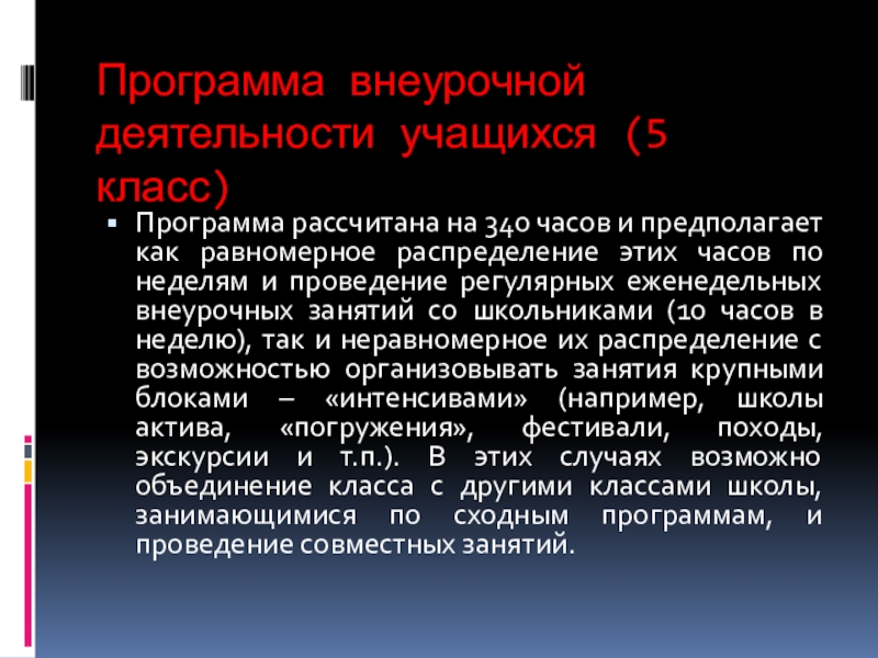 предполагает как равномерное распределение этих часов по неделям и проведение регулярных еженедельных внеурочных занятий со школьниками (10 часов в неделю), так и неравномерное их распределение с возможностью организовывать занятия крупными блоками – «интенсивами» (например, школы актива, «погружения», фестивали, походы, экскурсии и т.п.). В этих случаях возможно объединение класса с другими классами школы, занимающимися по сходным программам, и проведение совместных занятий.